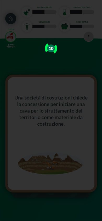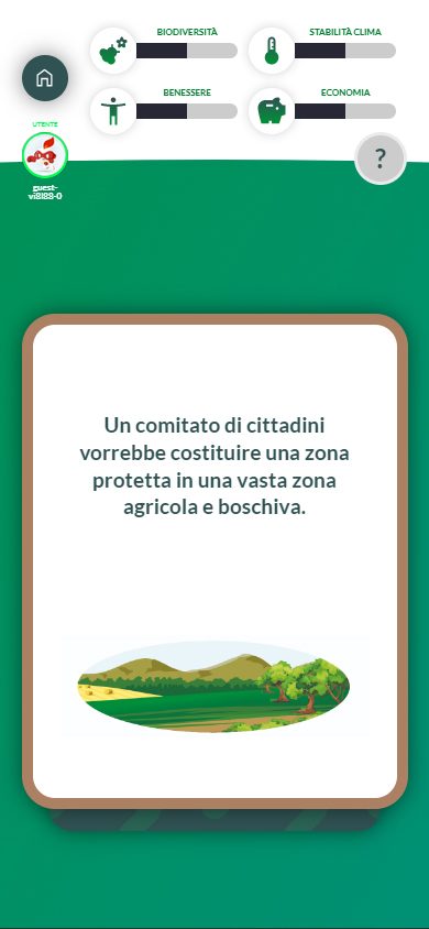 Partecipa e aiuta a determinare l'esito di ciascuna consultazione ma fai attenzione: ciascuna scelta ha implicazioni diverse su biodiversità, contributo alla stabilità del clima, benessere delle persone ed economia, che verranno evidenziate da dei punteggi positivi o negativi, e in alcuni casi potrà generare altri eventi a cascata con effetti tardivi che vedrai comparire solo in seguito, e per questi motivi non sempre sarà possibile rimediare alle scelte fatte... se uno dei quattro valori di punteggio scende a zero, la tua società andrà incontro ad alcuni problemi e avrai perso la sfida della sostenibilità!